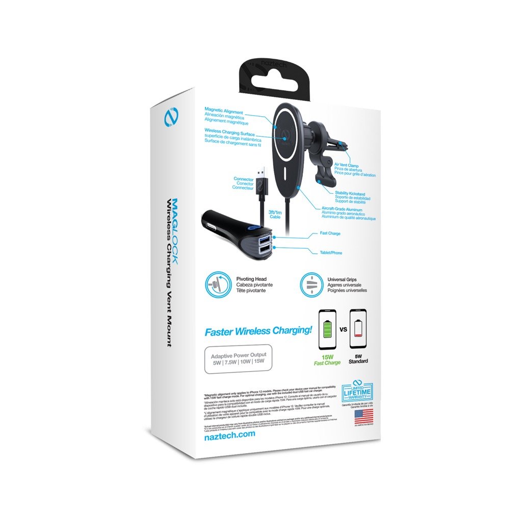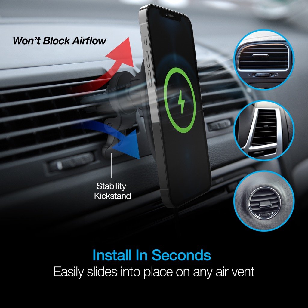 Enter the fast lane of charging! Just place your iPhone 12 or MagSafe case onto the MagLock Vent Mount and feel the powerful magnetic force latch onto your device. Keep your device at eye level and within easy reach for safer hands-free driving with the fastest wireless charging speeds. With 3X the power of standard wireless and wired chargers, the mount is engineered to get your device back to full faster than ever. Featuring a low profile, cradle-free design with aircraft-grade aluminum construction for a stylish, floating look as you drive. The mount’s rubberized grips easily slide into place, while the built-in stability kickstand adds support for heavier phones and protects your vents without blocking airflow. MagLock makes it easier than ever to fast charge on the road.